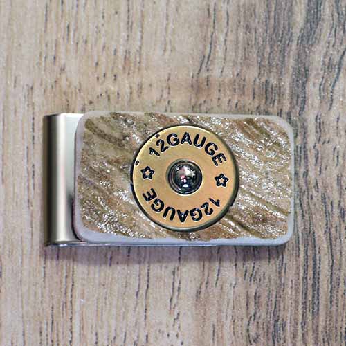 Made from naturally shed moose antler on a stainless steel money clip featuring a variety of western and wildlife metal inlays.